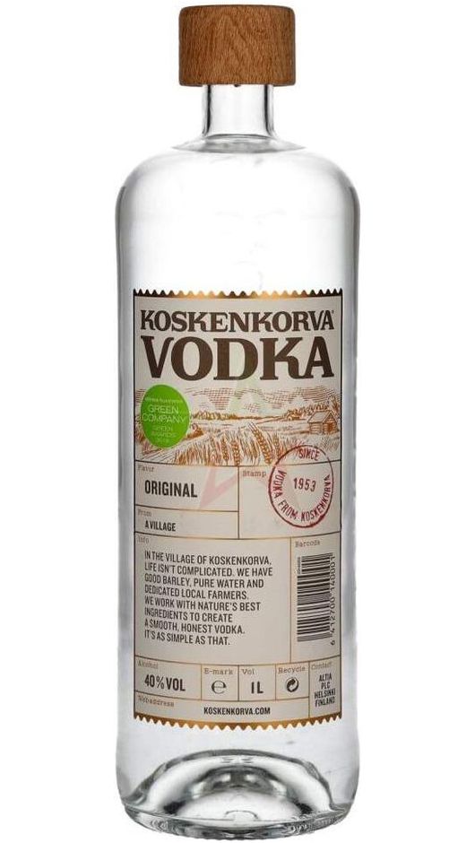 Vodka Original Pouring 100cl - Koskenkorva is born in the Finland region, a land renowned for the purity of its waters and the harsh climate, elements that help define the uniqueness of this vodka. Made through the fermentation of selected Finnish barley, the water used comes from crystalline sources, making the product extremely clean and clear on the palate.