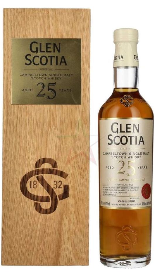 Le Glen Scotia Whisky Single Malt 25Yo 70cl - Astucciato - Glen Scotia représente un exemple raffiné de la tradition écossaise conçue dans la célèbre région de Campbeltown. Ce whisky, obtenu à partir d’orge maltée sélectionnée, vieillit pendant un quart de siècle en fûts de chêne, exprimant un équilibre parfait entre richesse aromatique et complexité structurelle.