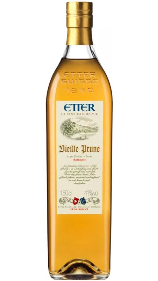 La Vieille Prune di Etter est un distillat précieux obtenu à partir de prunes sélectionnées avec soin, cultivées dans les terres fertiles de la région suisse du Valais, où le climat et le sol confèrent aux fruits un caractère unique. Le processus de distillation artisanale met en valeur la pureté des prunes mûres, tandis que le vieillissement en fûts de bois contribue à développer une structure douce et complexe, enrichie de délicates notes de vanille et d’épices douces.
