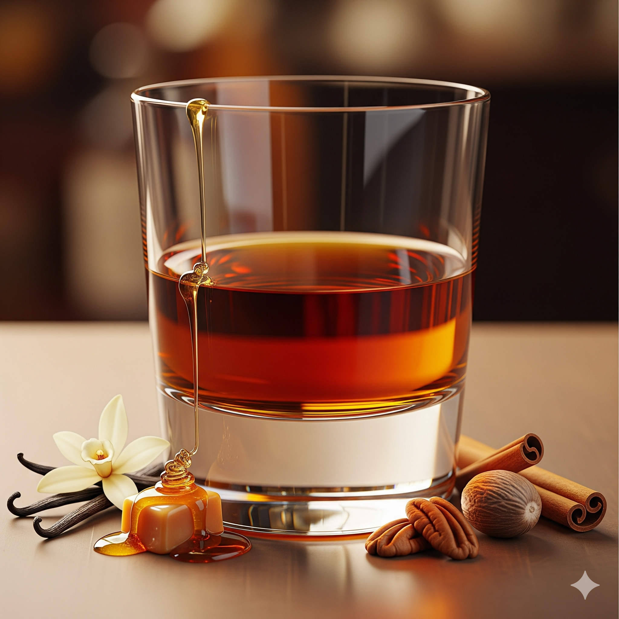 Al naso si apre con sentori caldi di vaniglia, miele e caramello, seguiti da note di tostatura, noce pecan e spezie dolci. In bocca è morbido ma strutturato, con un equilibrio perfetto tra dolcezza e profondità boisée, chiudendo con un finale rotondo e persistente, dal richiamo quasi cremoso.