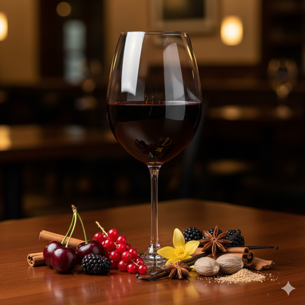 Al naso, il bouquet è ampio e fragrante, dominato da note di ciliegia, mora e ribes, accompagnate da accenti di spezie dolci, vaniglia e un tocco di legno tostato. Il profilo olfattivo è fresco e invitante, con una gioventù aromatica che si fa apprezzare già al primo impatto.