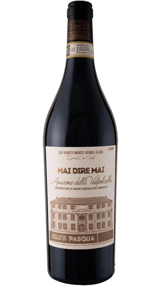 L’Amarone della Valpolicella DOCG Mai Dire Mai di Pasqua è un’espressione di grande eleganza e intensità, tipica del rinomato territorio veneto. Ottenuto da uve Corvina, Rondinella e Molinara, raccolte con cura nella zona classica della Valpolicella, questo vino si distingue per il tradizionale metodo dell’appassimento, che concentra i profumi e i sapori. Dopo una lenta fermentazione e un affinamento in botti di rovere, il Mai Dire Mai propone un bouquet complesso, con sentori di frutta rossa matura, ciliegia, spezie dolci e tocchi di cioccolato fondente.