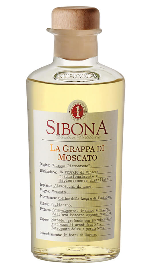 La Grappa Piemontese di Moscato Sibona si presenta nel calice con un color giallo paglierino tenue; all'olfatto conquista e seduce con il suo intenso bouquet, tipico dell'uva moscato appena raccolta. All'assaggio si evince un corpo morbido e delicato, con un'aromaticità inconfondibile e ricca di aromi fruttati, mentre sul finale offre un retrogusto piacevolmente dolce e persistente.